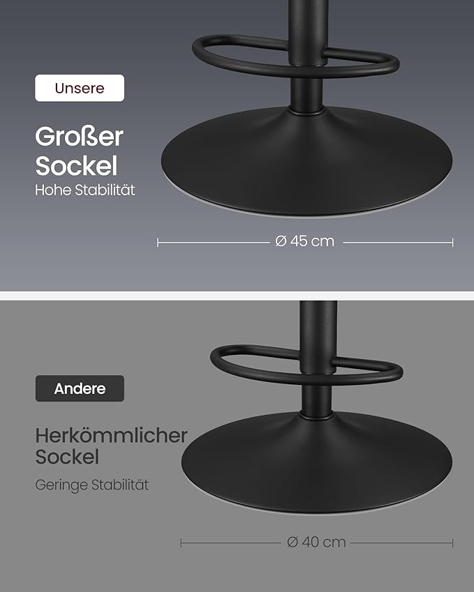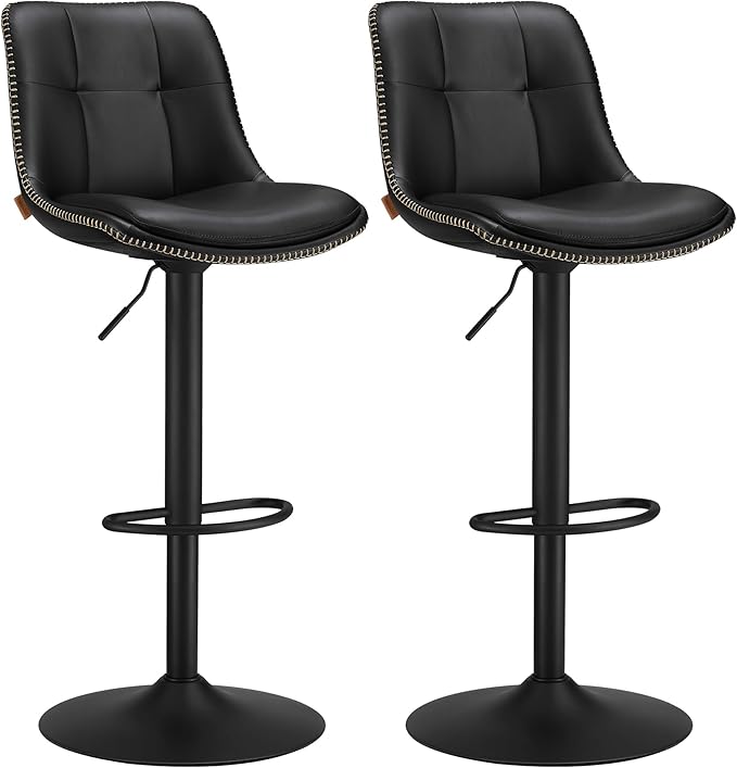 Disse 2 højdejusterbare og 360° drejbare barstole er lavet med polstreret skum og lædersæde overtrukket af sort kunstlæder som er nem at rengøre med en klud. Bunden på trompetfoden gør ikke kun stolen skridsikker, men beskytter også gulvet mod ridser.