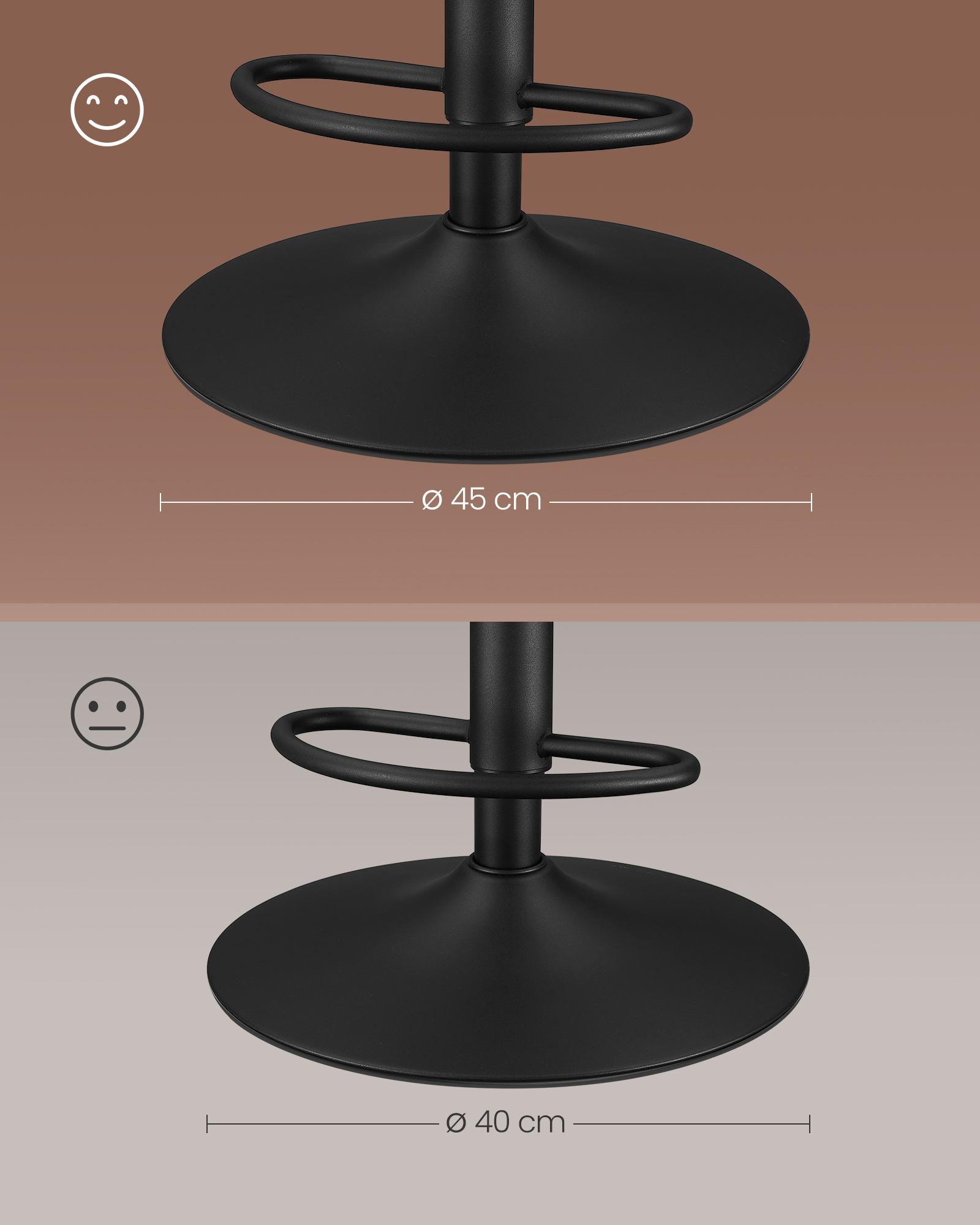 En vaklende barstol kan påvirke vores gode humør. Derfor er disse højdejusterbare barstole udstyret med metal trompetfod, som giver god stabilitet. Forkæl dig selv med disse høje barstole med et flot design i kunstlæder.