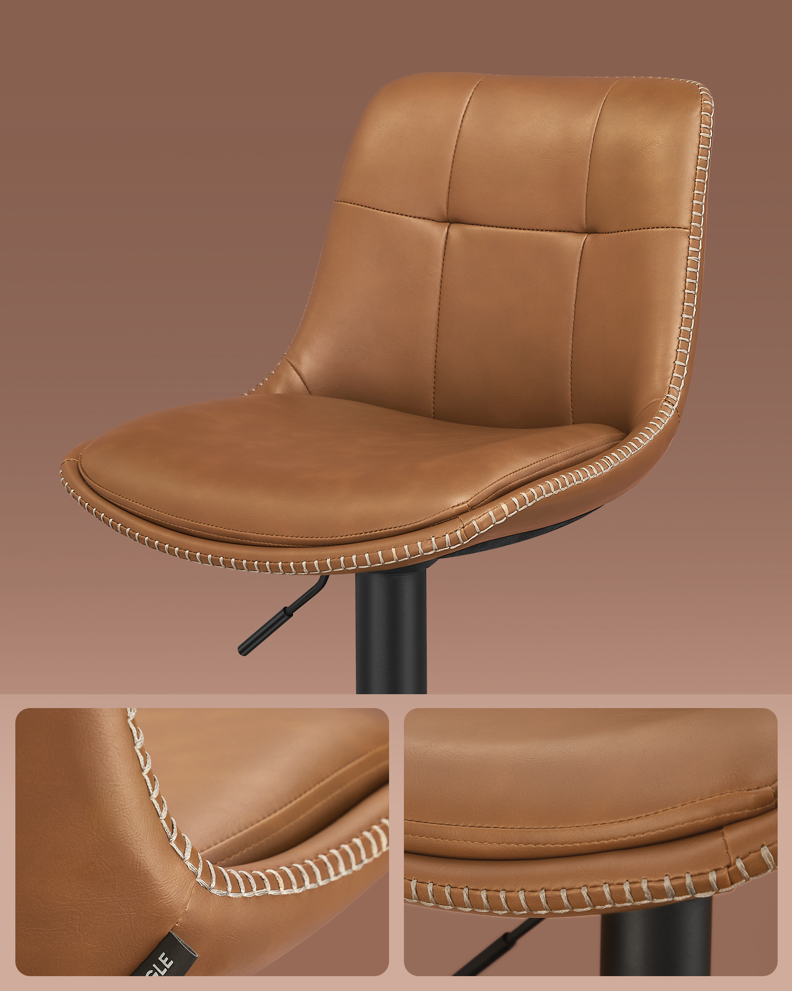 Disse 2 højdejusterbare og 360° drejbare barstole er lavet med polstreret skum og lædersæde overtrukket af brun kunstlæder som er nem at rengøre med en klud. Bunden på trompetfoden gør ikke kun stolen skridsikker, men beskytter også gulvet mod ridser.