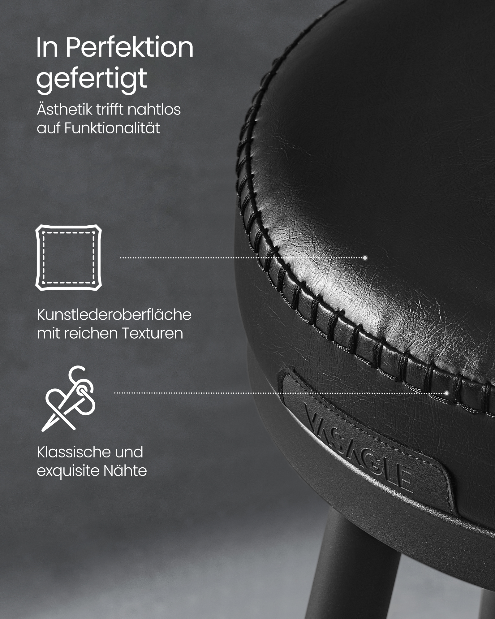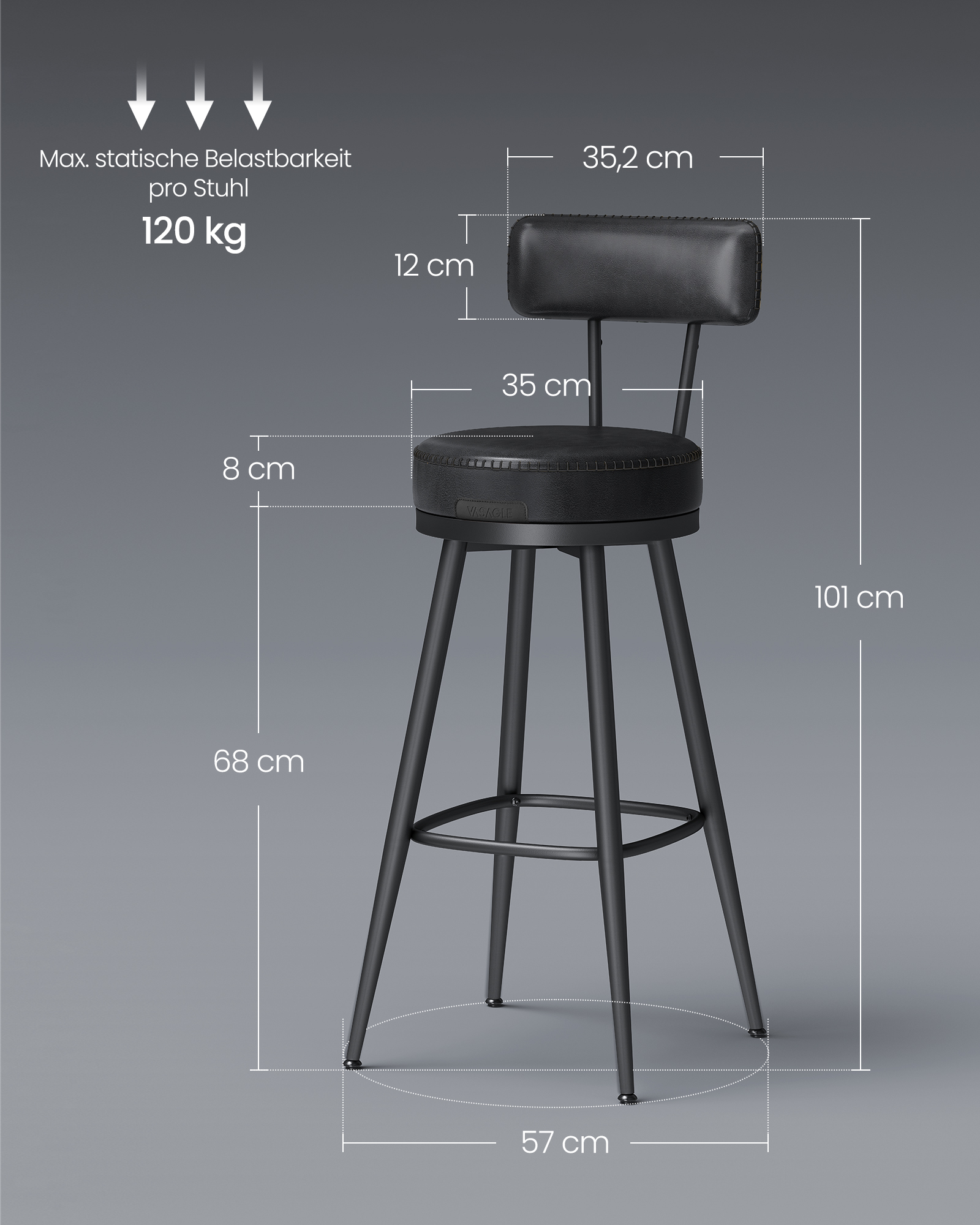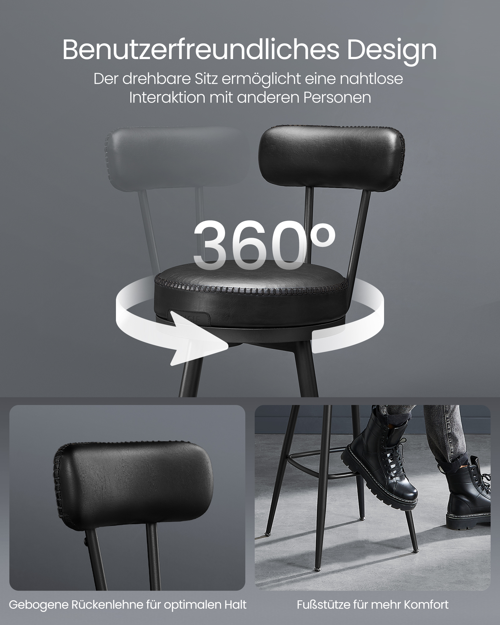 Barstole i industrielt design med 360° roterende lædersæde, ryglæn og 4 tilspidsede metalben - designet til din komfort med støttende højelastiske skum overtrukket af sort kunstlæder med dekorative syninger. Disse høje stole til barer med lædersæde og ryglæn i kunstlæder og sorte tilspidsede metalben tilbyder dig en stor komfort, som du kan bruge til afslappende stunder i køkken og bar.