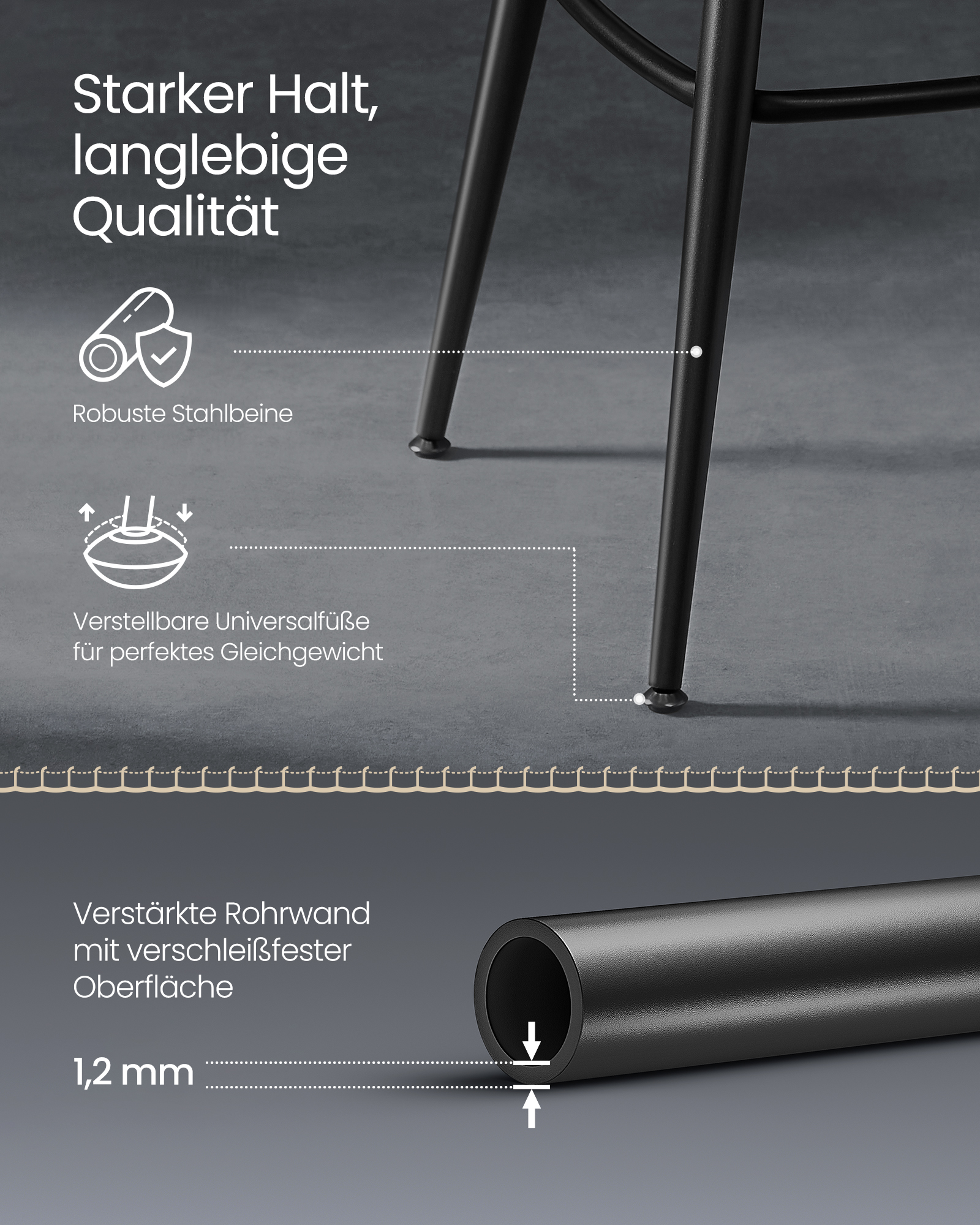 Det syntetiske læderbetræk, kan nemt rengøres med en fugtig klud på et øjeblik. De udadgående tilspidsede metalben, som danner en bundsolid base, kombineret med justerbare universalfødder, giver høj stabilitet på ujævne gulve og beskytter gulvet mod ridser.
