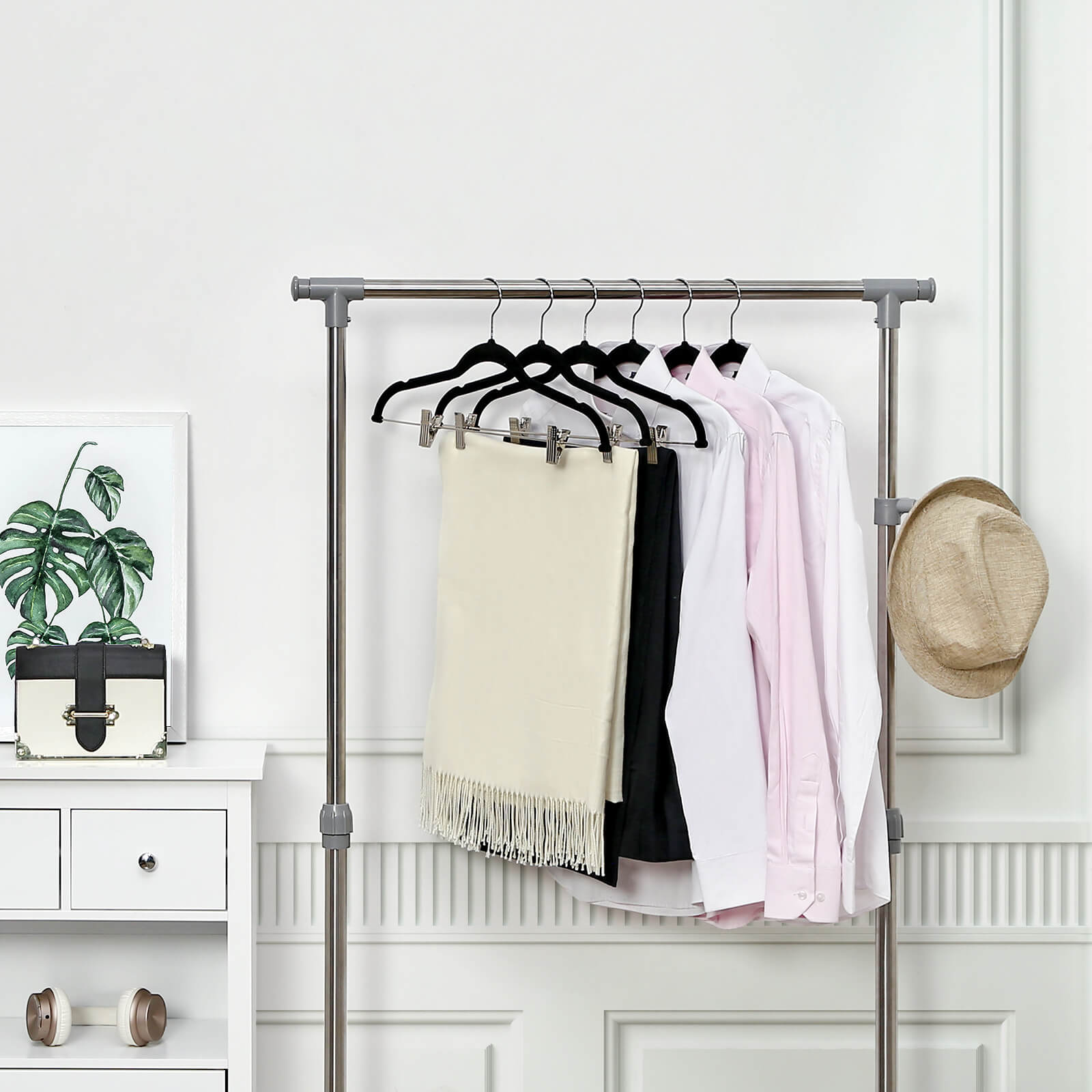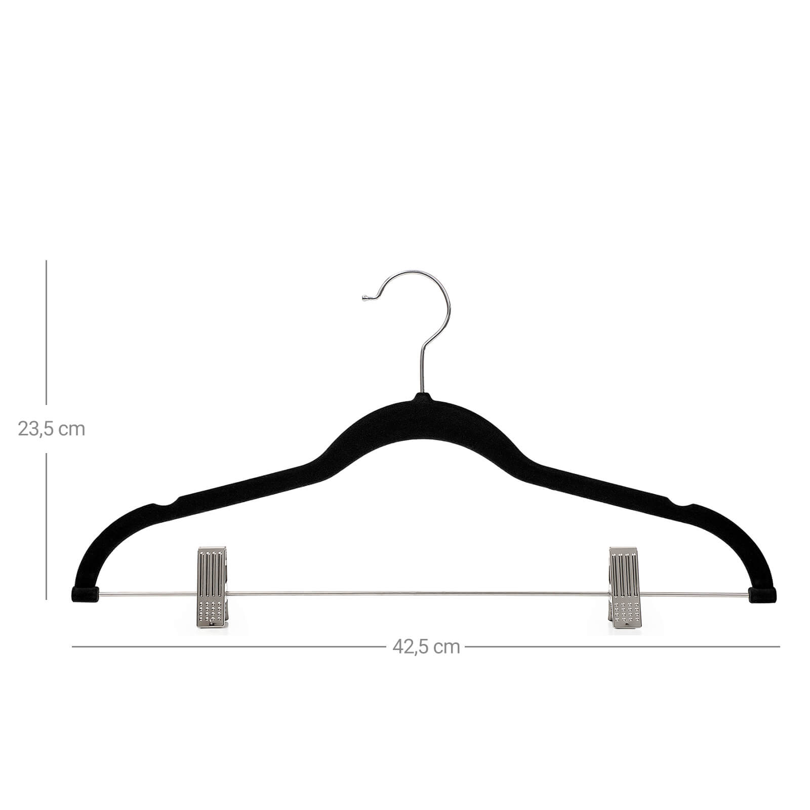Er du træt af at samle skjorter, bukser, jakker, slips og frakker op, der ofte glider ned på gulvet, så er disse 12 stk skridsikre sorte bøjler med bukseklemmer velegnet til dig. Den blide, skridsikre overflade i velour, holder godt på tøjet, så ikke engang din silkebluse glider af og klemmerne med beskyttende plast, holder bukser og nederdele fast uden grimme mærker fra klemmerne.