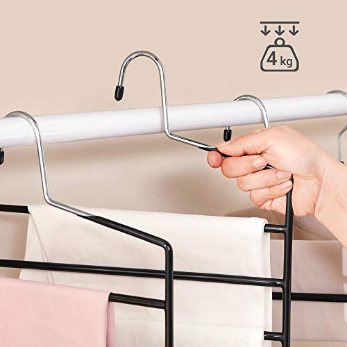 Sampak på 4 stk pladsbesparende buksebøjler med plads til 5 bukser. På disse bøjler kan man hænge 5 par bukser på samme buksebøjle, hvilket sparer masser af skabsplads.