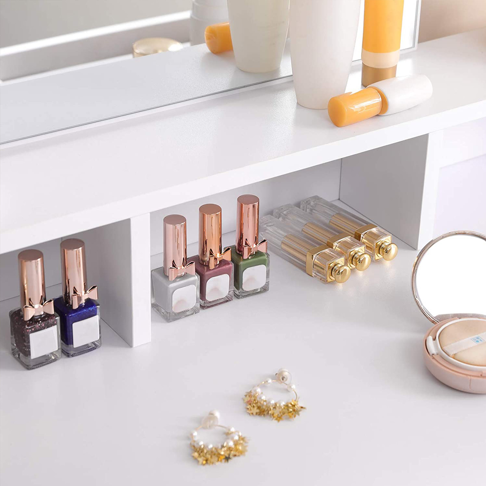 Er du træt af at lede efter din kosmetik og make-up hver dag? Øjenskygger og pudder kan opbevares i makeupbordets 2 store skuffer, neglelak kan opbevares i de 3 åbne rum og parfumerne kan udstilles på den hævede platform.