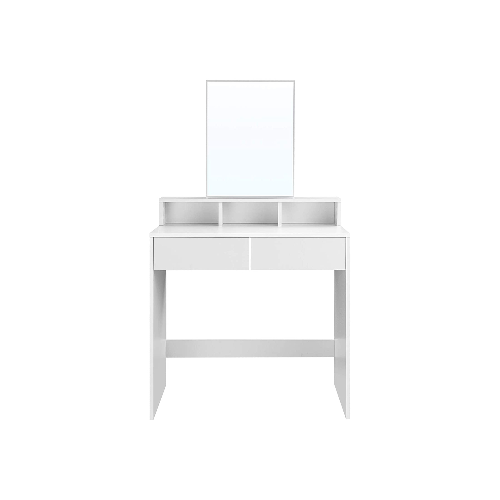 Således får du et sminkebord med 2 skuffer, 3 åbne rum og et stort rektangulært spejl, hvor du kan sminke dig selv hver dag. Fastgør makeupbordet til væggen med det medfølgende anti-tip-tilbehør, og start en ny og elegant skønhedsrutine.