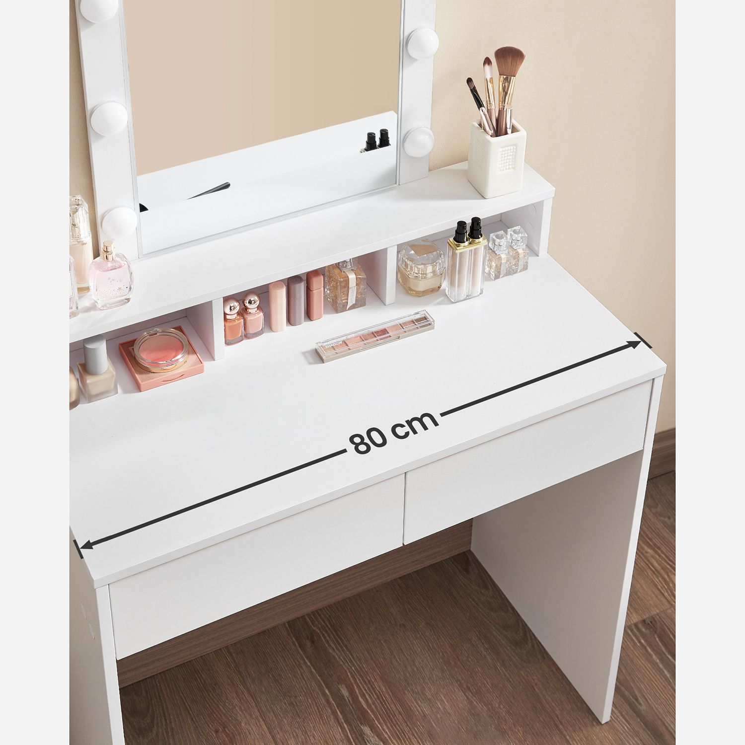Makeupbord - sminkebord med dæmpbar lys, spejl og skuffer - hvid 80 x 40 x 145 cm