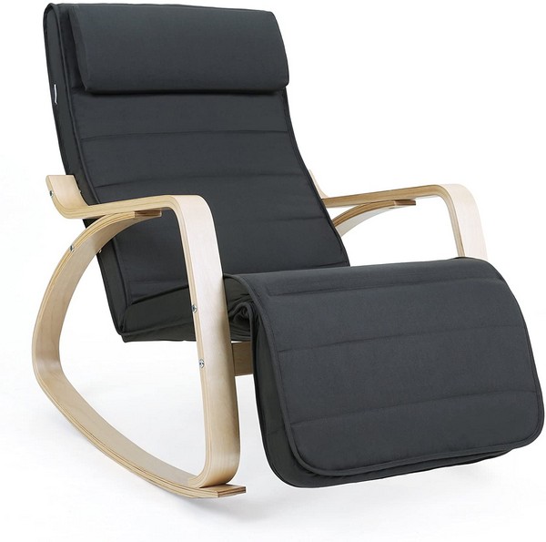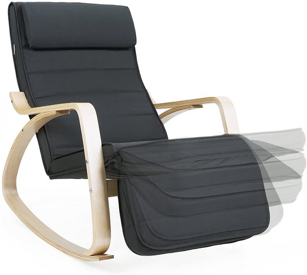Kombinationen af trendy design og høj siddekomfort gør denne gyngestol med justerbar fodstøtte til et populært boligmøbel. Den robuste gyngestol af lyst birketræ byder på en "allround følelse af velvære" takket være dens ergonomisk udformede form og det behagelige sæde på betrækket af mørkegrå bomuld med tæt skumfyld.