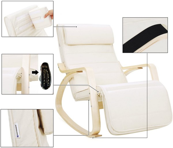 Kombinationen af trendy design og høj siddekomfort gør denne gyngestol med justerbar fodstøtte til et populært boligmøbel. Den robuste gyngestol af lyst birketræ byder på en "allround følelse af velvære" takket være dens ergonomisk udformede form og det behagelige sæde på betrækket af beige bomuld med tæt skumfyld.