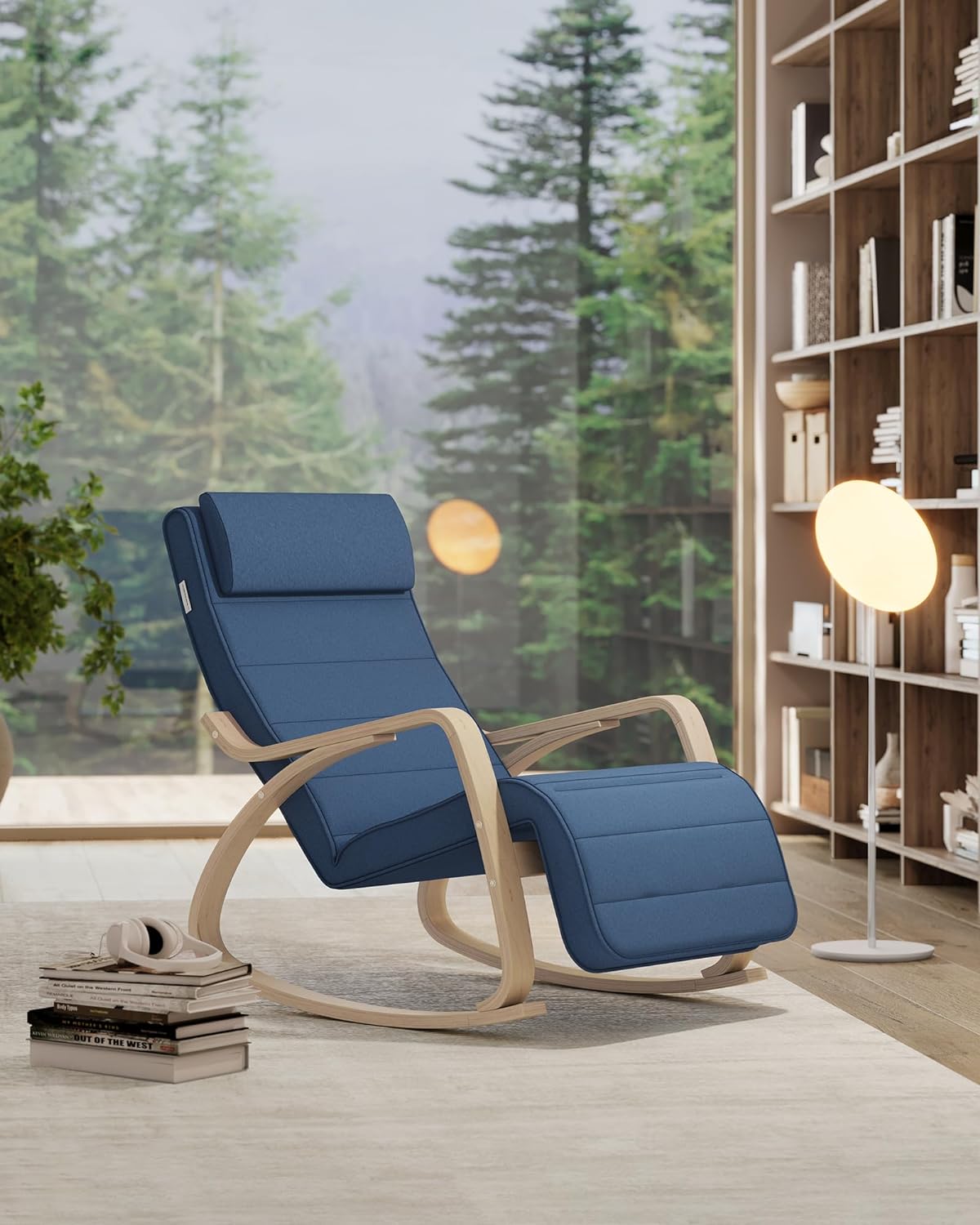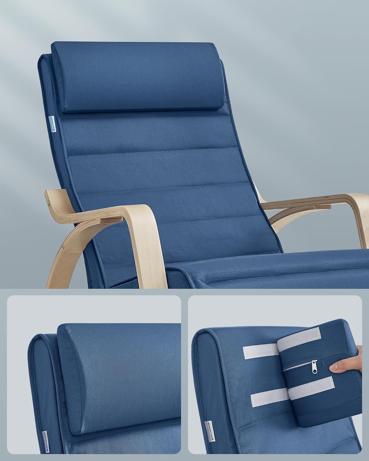 Kombinationen af trendy design og høj siddekomfort gør denne gyngestol med justerbar fodstøtte til et populært boligmøbel. Den robuste gyngestol af lyst birketræ byder på en "allround følelse af velvære" takket være dens ergonomisk udformede form og den behagelige blå stof hynde med tæt skumfyld.