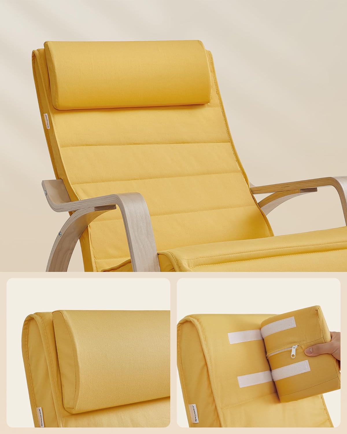 Gyngestol i birketræ med 5-trins justerbar fodstøtte - gul stof hynde 121.5 x 67 x 84 cm
