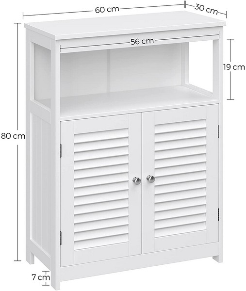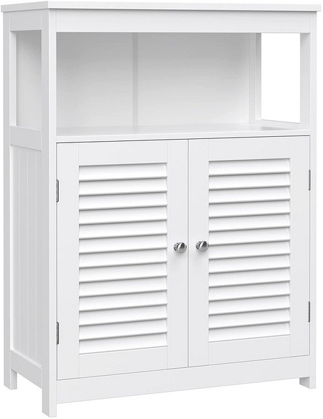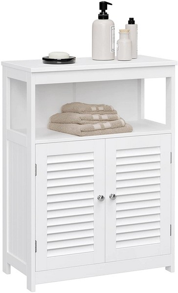 Badeværelsesskab med døre og åben hylde, der passer ind i de fleste rum.