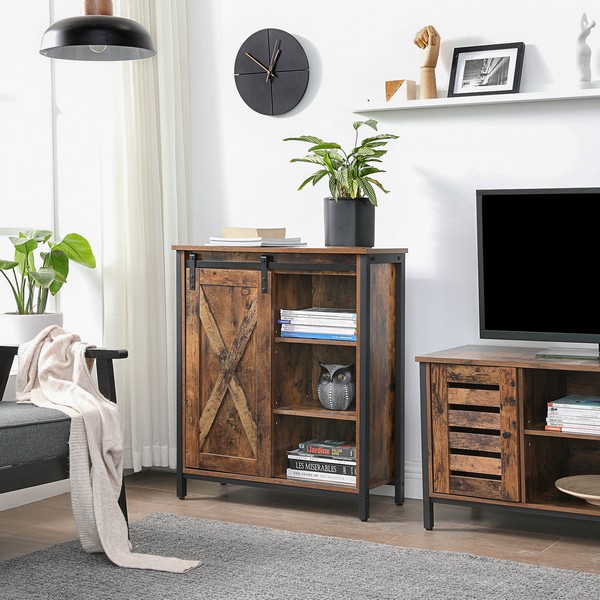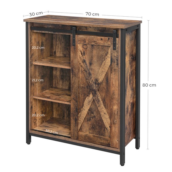 Ud over sit flotte rustik brune look har dette skab også praktiske funktioner. Opbevaringsskabet har skab, skydelåge og 2 højdejusterbare hylder.