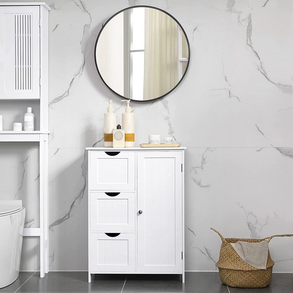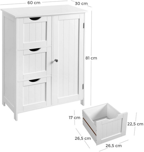 Badeværelsesskab med 3 skuffer og skab med hylde, der passer ind i ethvert rum.