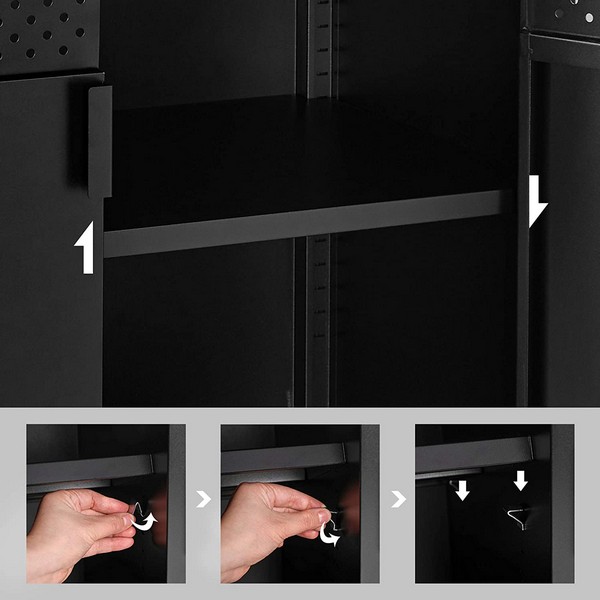 Her fås en sort skænk i stål, med tophylde, skab med højdejusterbar hylde og justerbare ben. Dette overflødighedshorn af opbevaringsplads og industrielt design med rustik brun stil, indgår i mange af vores møbler.