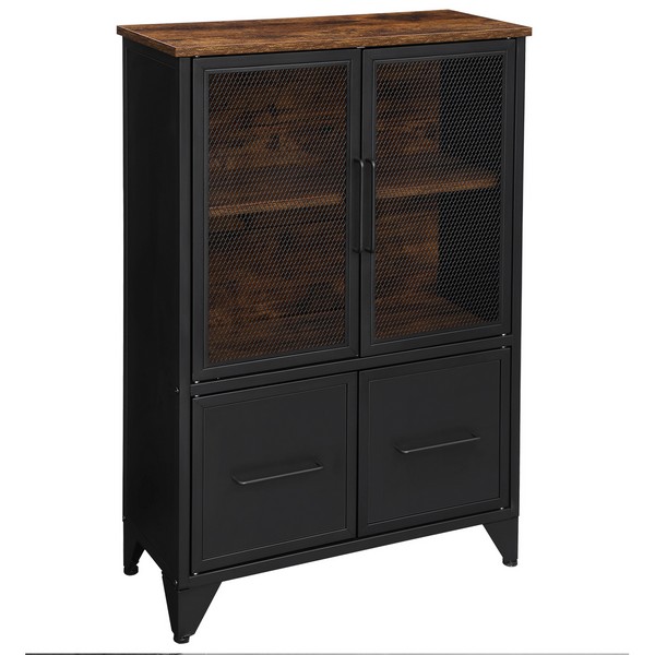 Ud over sit flotte sorte og rustik brune look har denne skænk i industrielt design også gode praktiske funktioner. Opbevaringsskabet har skabe med skabslåger, låger med trådnet, indvendige hylder og topplade.
