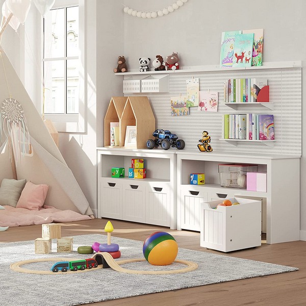Børn kan nemt tage de 3 kasser ud - hver med 4 hjul., Den lille kommode er 60 cm høj, så børn nemt kan nå deres legetøj.