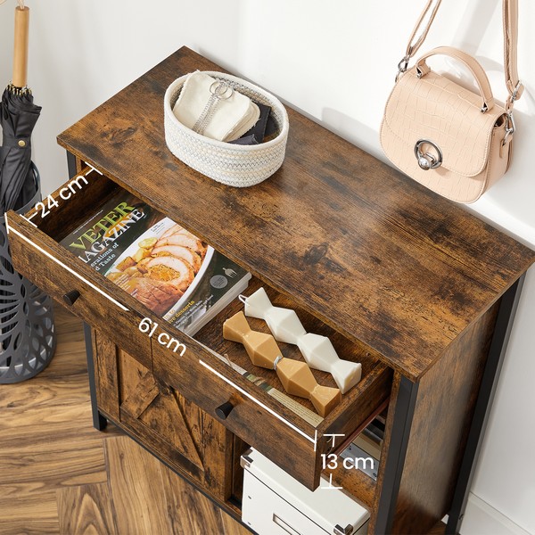 Ud over det flotte rustik brune look i industrielt design, har denne skænk også gode praktiske funktioner - den kan f.eks. anvendes som kommode. Opbevaringsskabet har topplade, skuffe, åbne opbevaringshylder til opbevaring og skab med skydelåge.