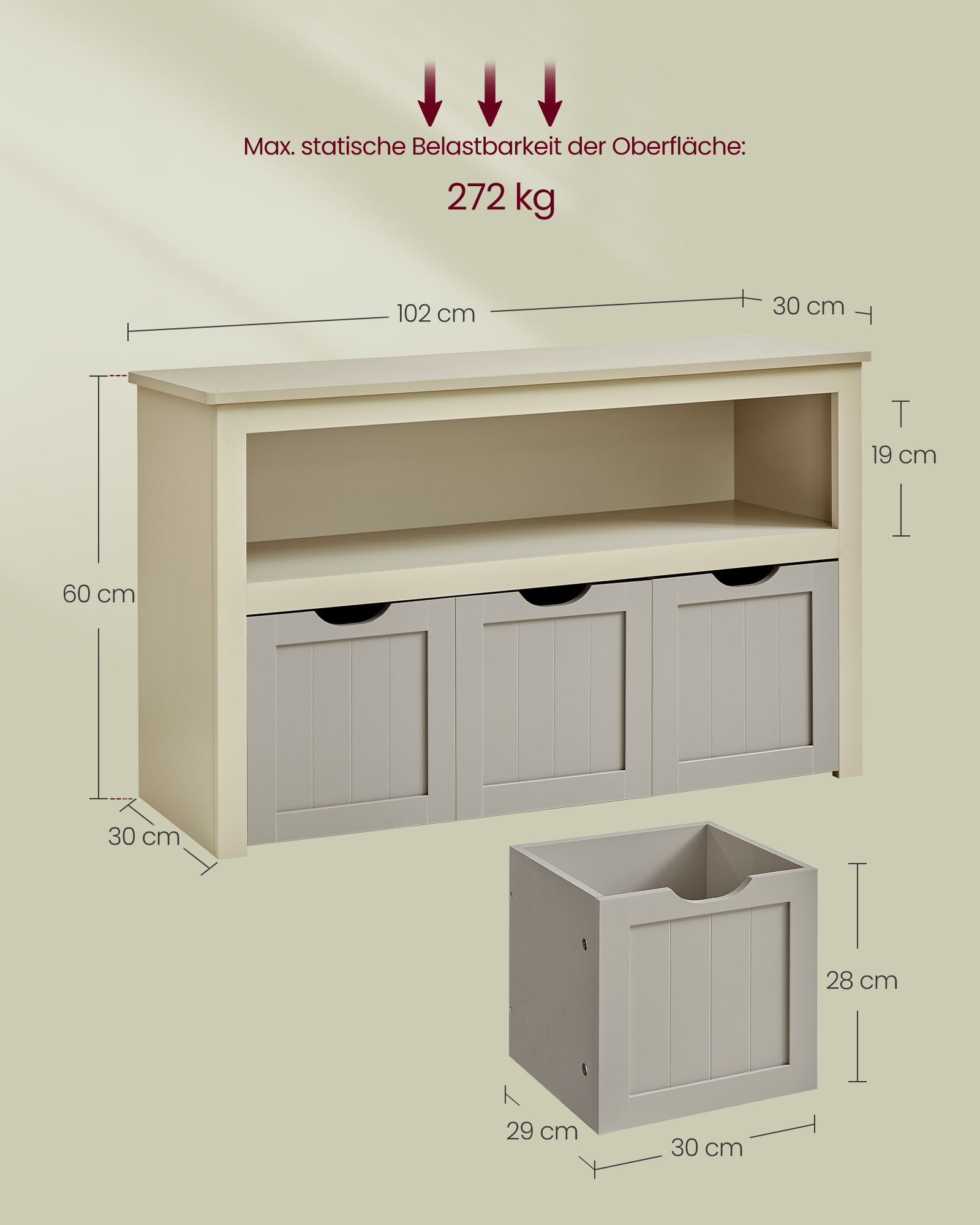 – Størrelse: 102 x 30 x 60 cm (B x D x H)