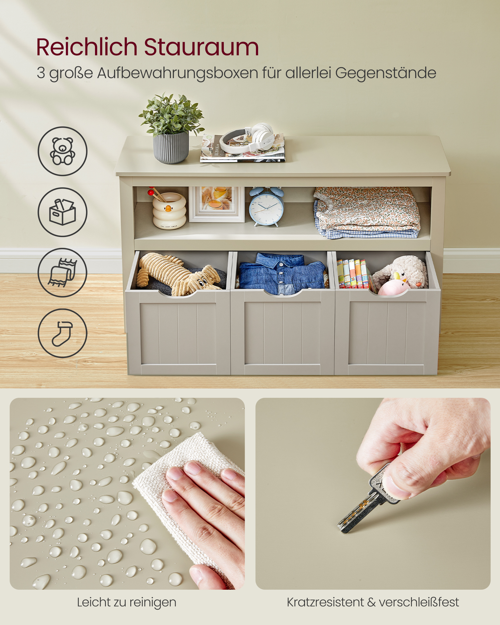 Flyder billedbøgerne og legetøjet rundt omkring? Med denne lille kommode til børneværelset, kan man nemt rydde op i det hele. Takket være den beige overflade og det enkle look passer kommoden ind i din stue, soveværelse eller børneværelse.