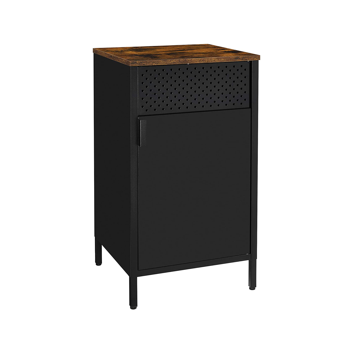 Opbevaringsskab i industrielt design med rustik brun topplade, ventilationshuller og sort stål.