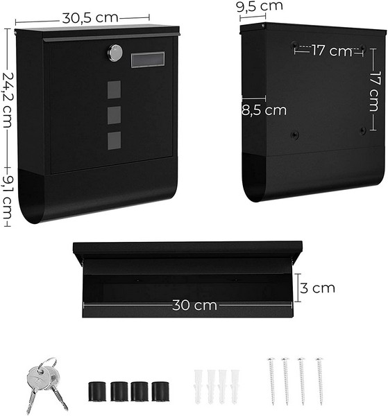 Takket være det store indkast giver modellen mulighed for en masse post. Den væghængte postkasse monteres hurtigt og nemt. Monteringsmaterialet er inkluderet såvel som nøgler til låsen.