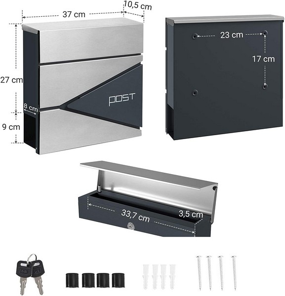 Takket være det store indkast giver modellen mulighed for en masse post. Den væghængte postkasse monteres hurtigt og nemt. Monteringsmaterialet er inkluderet såvel som nøgler til låsen.