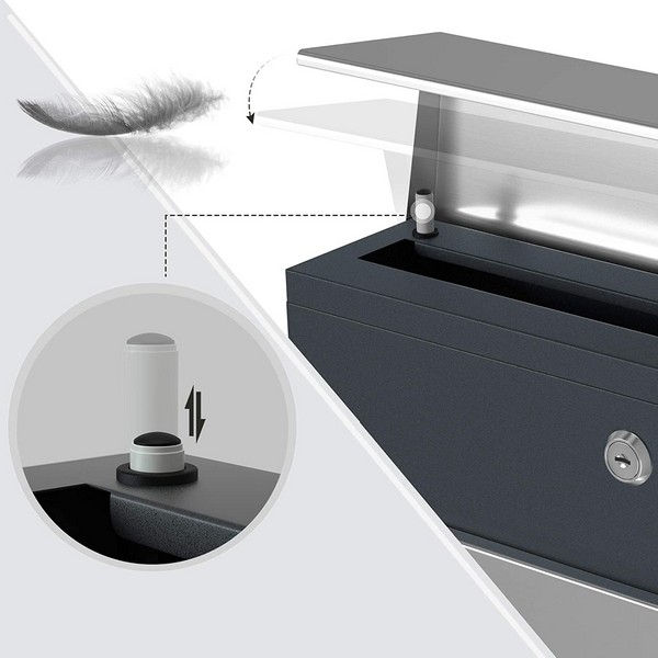 Brevkassen er lavet af rustfrit og pulverlakeret stål som giver postkassen en høj styrke og en lang levetid - og så har denne væghængt brevkasse et praktisk avisrør til aviser. Det moderne design suppleres af fronten med lukkemekanisme der får låget til at lukke blødt, langsomt og lydløst.