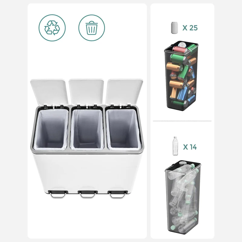 Denne skraldespand inkluderer affaldssortering med 3 aftagelige plastik spande på hver 18L for nem rengøring, hvis din affaldspose ved et uheld går i stykker og spilder.