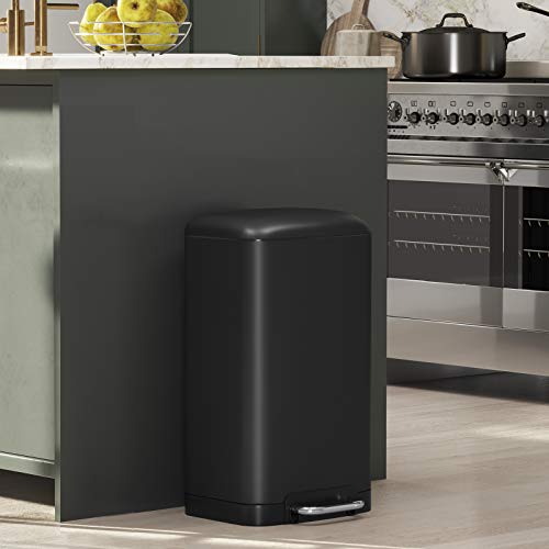 Sort pedalspand på 30 liter med en indvendig plastspand, hængslet låg og blød lukkemekanisme for nem bortskaffelse af affald.