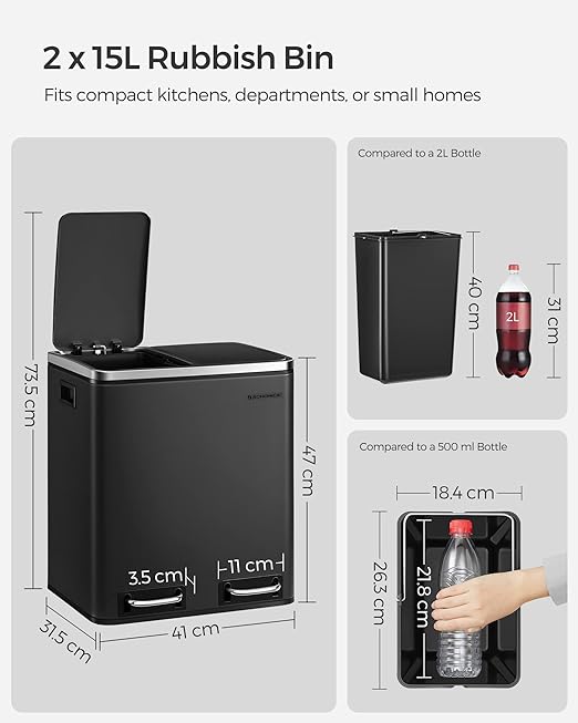Denne skraldespand inkluderer affaldssortering med 2 aftagelige plastik spande på hver 15L for nem rengøring, hvis din affaldspose ved et uheld går i stykker og spilder.