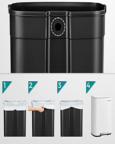 Skraldespanden inkluderer en aftagelig plastik spand med et posehul, så du kan holde plastikposen på plads. Hvis skraldeposen går i stykker ved et uheld og spilder, så kan du blot tage spanden ud og nemt rengøre den.