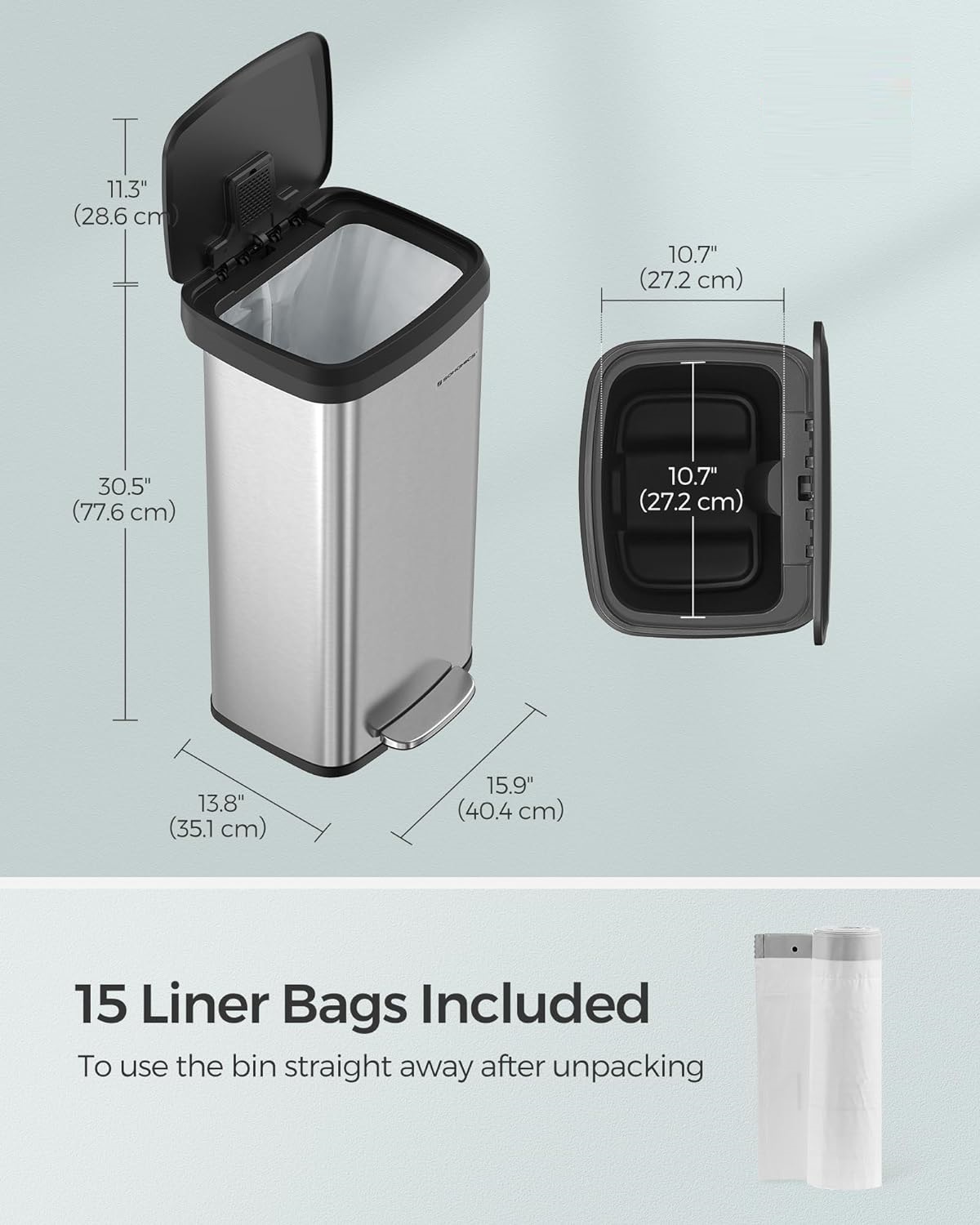 [Kvalitets rustfrit stål] Denne skraldespand er lavet af rustfrit stål og er nem at rengøre. Det tilføjer et stilfuldt moderne touch til ethvert køkken.