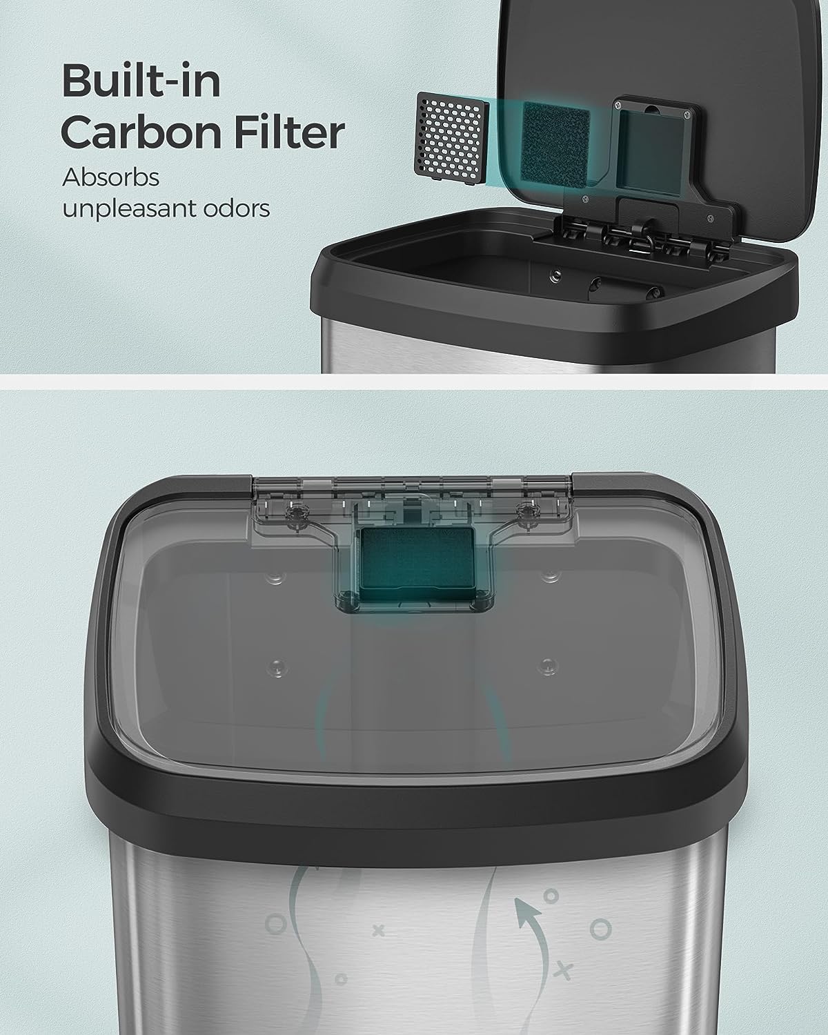 [Tænksomme detaljer] Kulfilteret i låget hjælper med at absorbere ubehagelige lugte og holder dit køkken duftende frisk. Inkluderet er 15 skraldeposer.