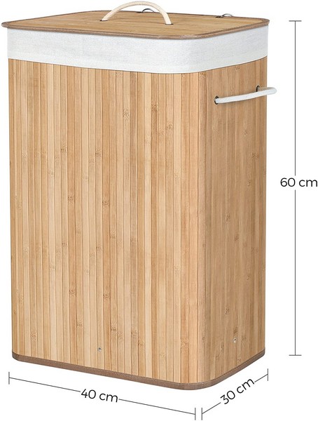 Vasketøjskurv i brun bambus med hængslet låg og vasketøjspose på 70 liter. Brun vasketøjskurv i bambus, som giver masser af plads til at samle og opbevare vasketøjet.