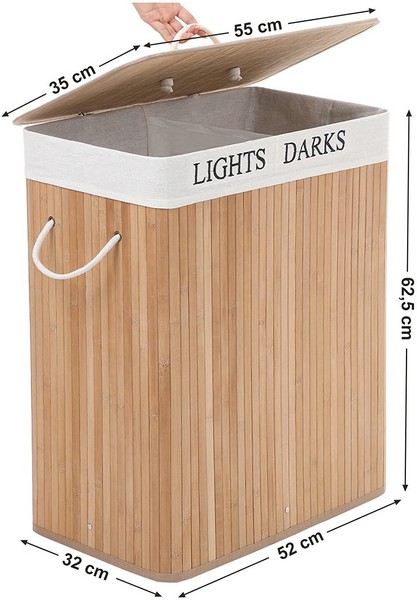 Praktisk, dekorativ og moderne brun vasketøjskurv i bambus med 100 liters 2 delt aftagelig vasketøjspose, der hjælper med opbevaring af snavset tøj.