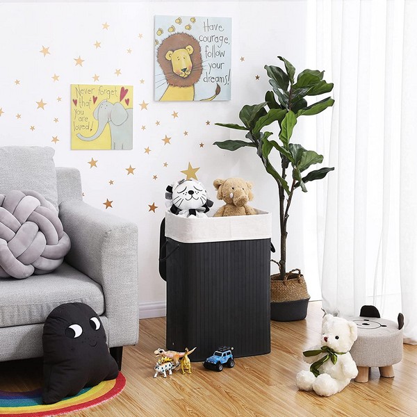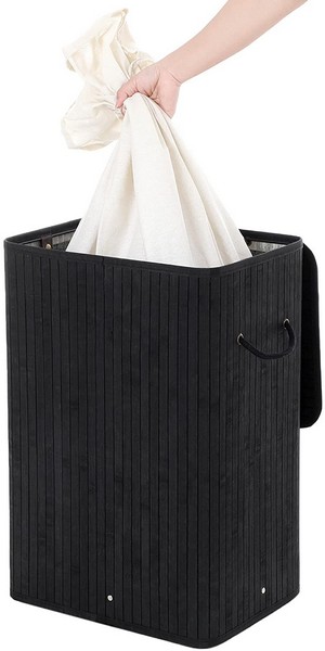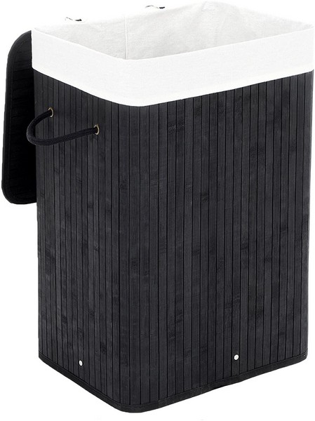 Praktisk, dekorativ og moderne sort vasketøjskurv i bambus med 70 liters vasketøjspose, der hjælper med opbevaring af snavset tøj.