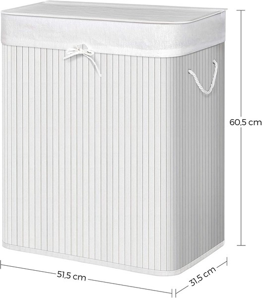 Vasketøjskurv i bambus med hængslet låg og 2 delt aftagelig vasketøjspose på 100 liter - 51.5 x 31.5 x 60.5 cm - hvid