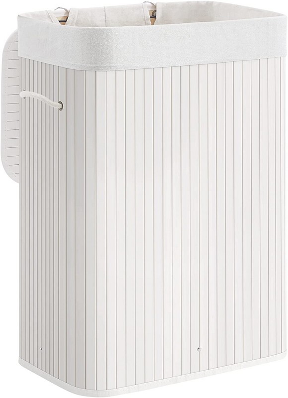 Praktisk, dekorativ og moderne hvid vasketøjskurv i bambus med 70 liters vasketøjspose, der hjælper med opbevaring af snavset tøj.
