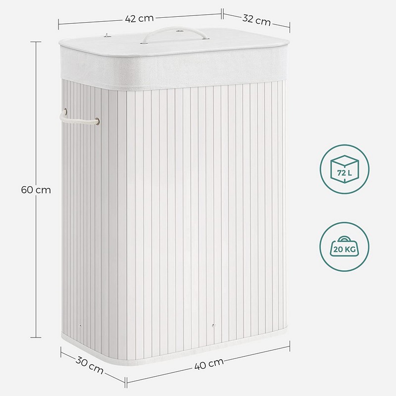 Vasketøjskurv i bambus med hængslet låg og vasketøjspose på 70 liter - 60 x 40 x 30 cm - hvid