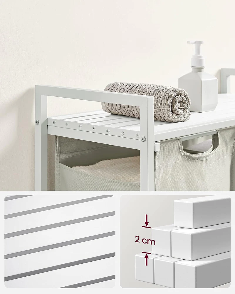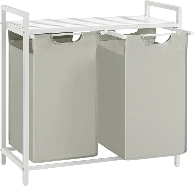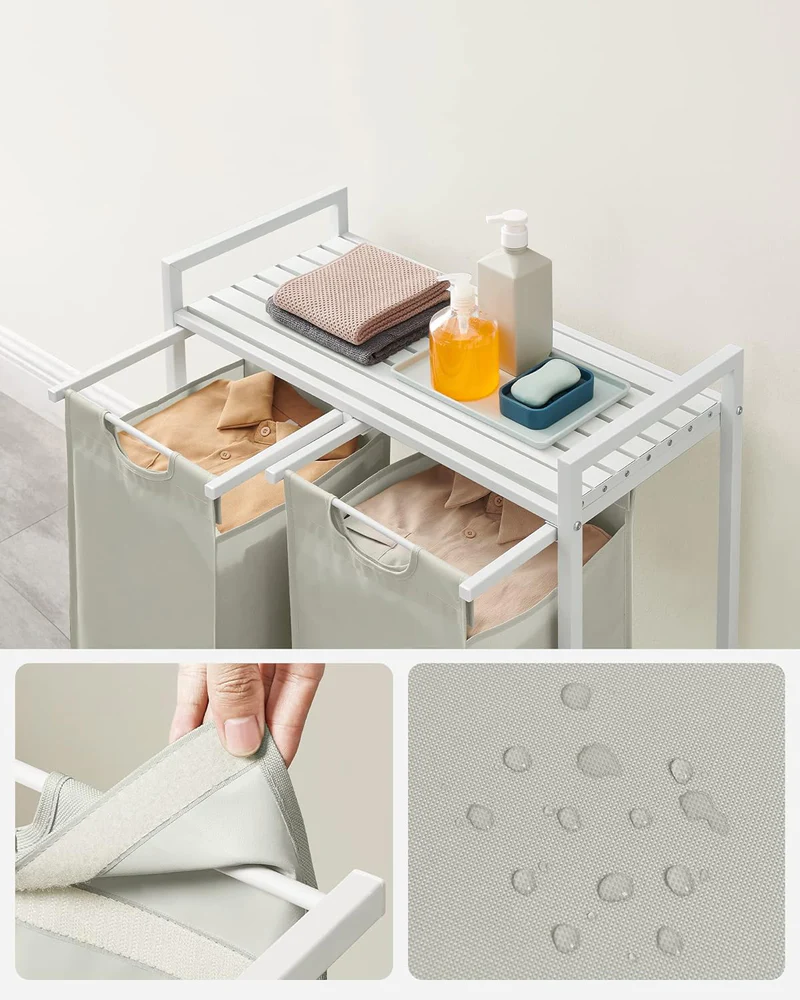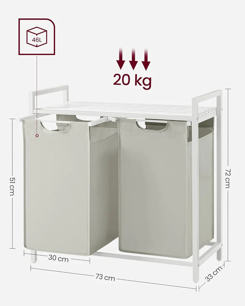 Denne vasketøjskurv med 2 rum på i alt 92 liter, består af 2 vævede vasketøjsposer i Oxford stof, hver på 46 liter, som hjælper dig med at sortere vasketøj efter farve og en hvid hylde, så vaskemiddel og skyllemiddel er lige ved hånden.