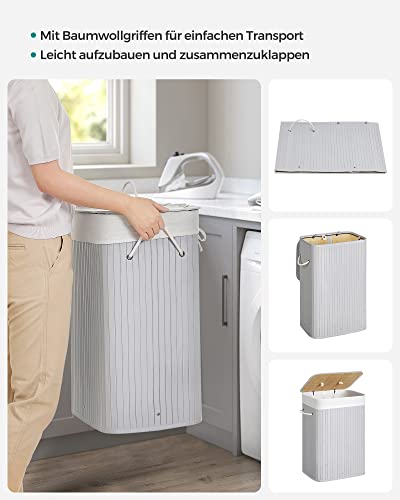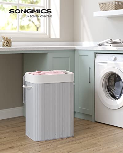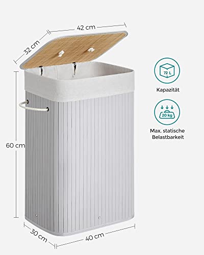 Praktisk, dekorativ og moderne grå vasketøjskurv i bambus med 70 liters vasketøjspose, der hjælper med opbevaring af snavset tøj.