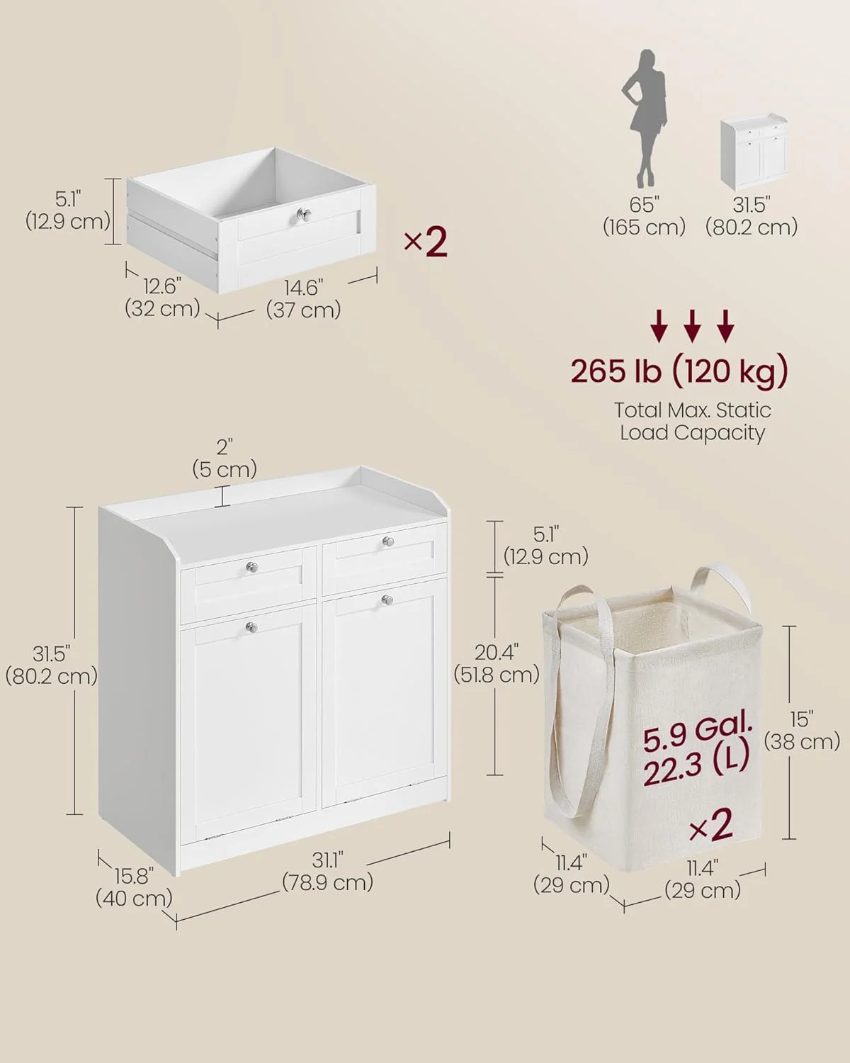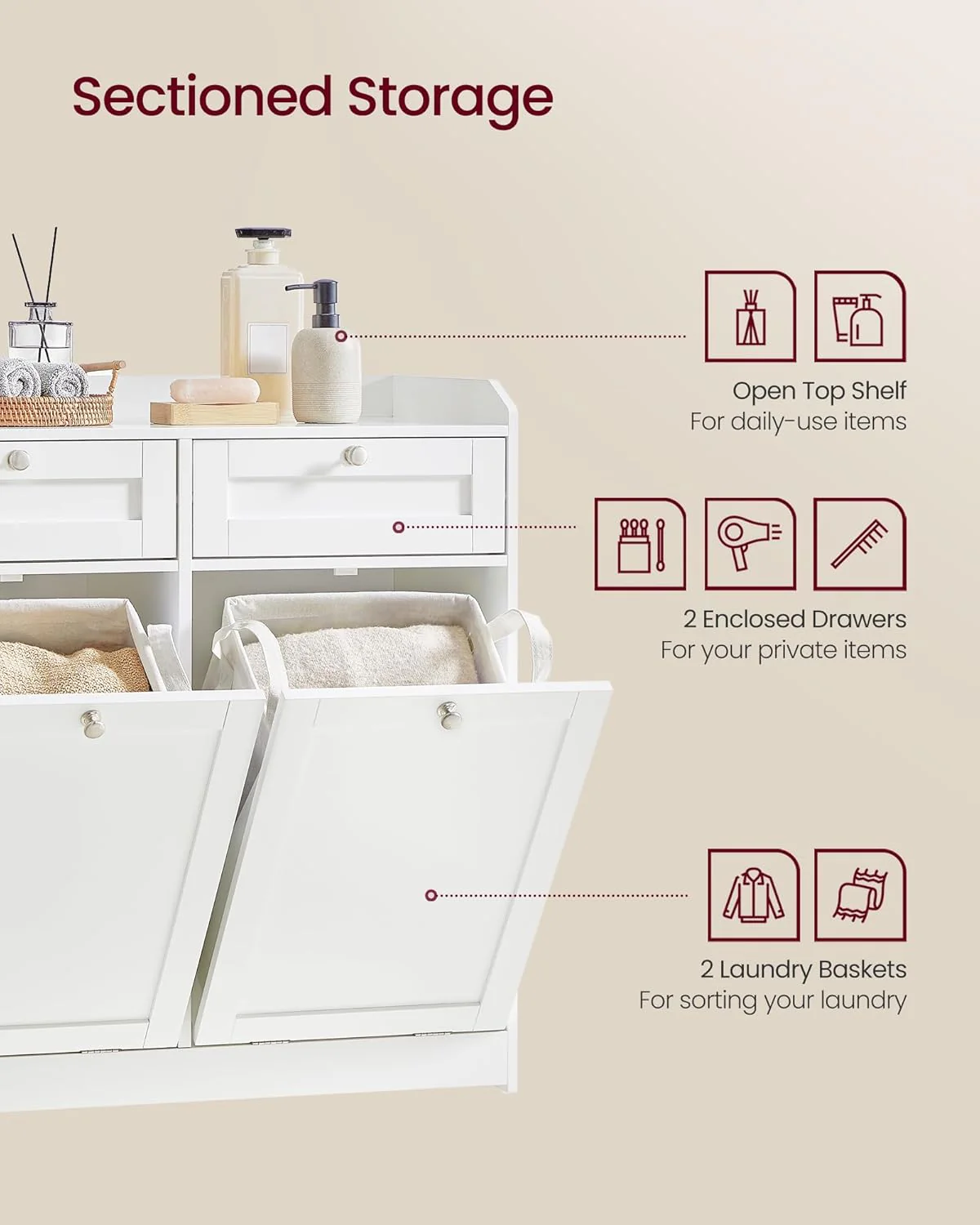 Aftagelige og bærbare vasketøjsposer: På vaskedagen kan du uden besvær løfte de indvendige vasketøjsposer ud af det vippelige vasketøjsskab. Med stofposernes praktiske dobbelte håndtag kan du nemt tage vasketøjsposerne ud af vasketøjsskabet og bære stofposerne hen til vaskemaskinen.