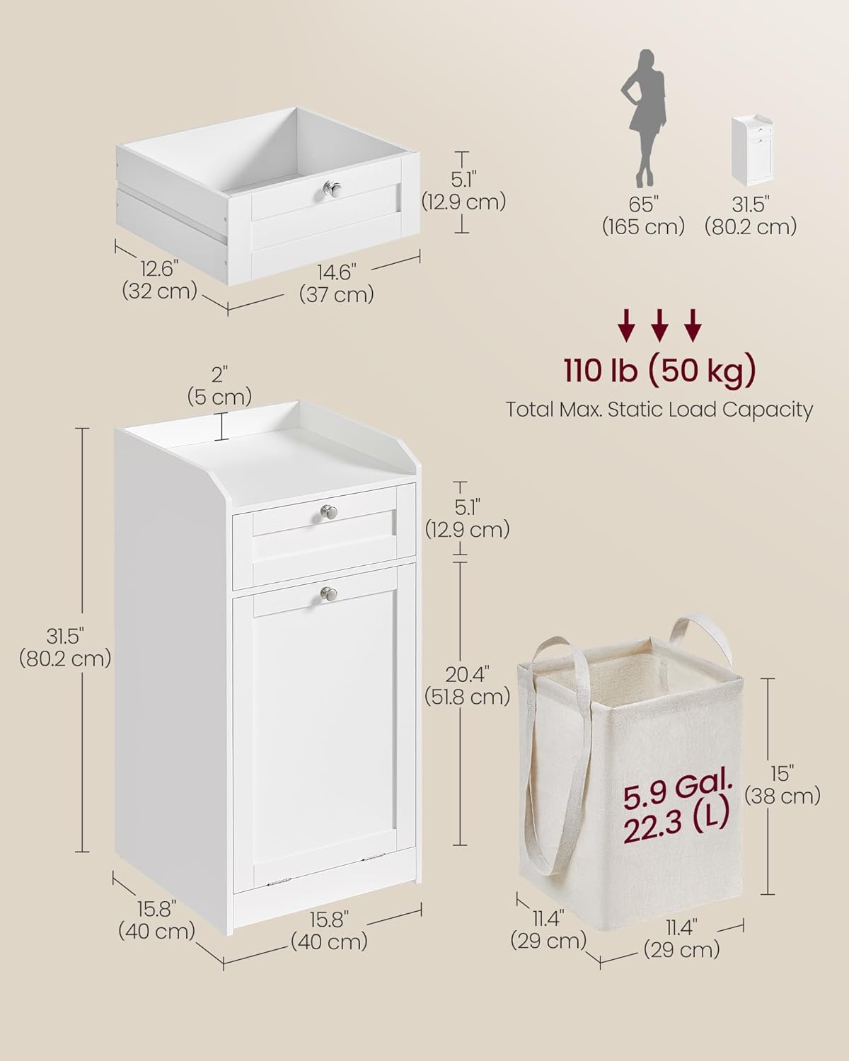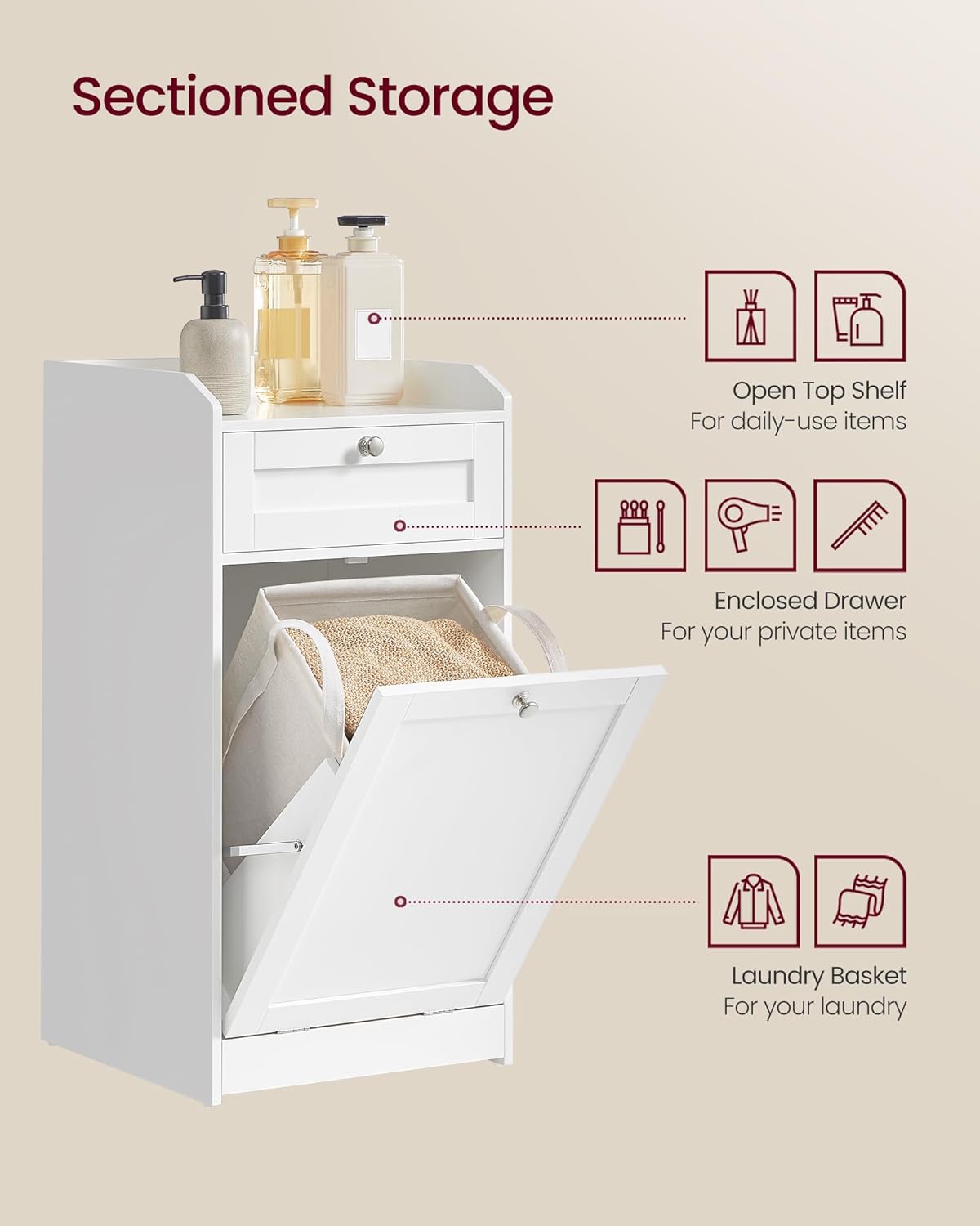 Aftagelige og bærbare vasketøjspose: På vaskedagen kan du uden besvær løfte den indvendige vasketøjspose ud af det vippelige vasketøjsskab. Med stofposens praktiske dobbelte håndtag kan du nemt tage vasketøjsposen ud af vasketøjsskabet og bære stofposen hen til vaskemaskinen.