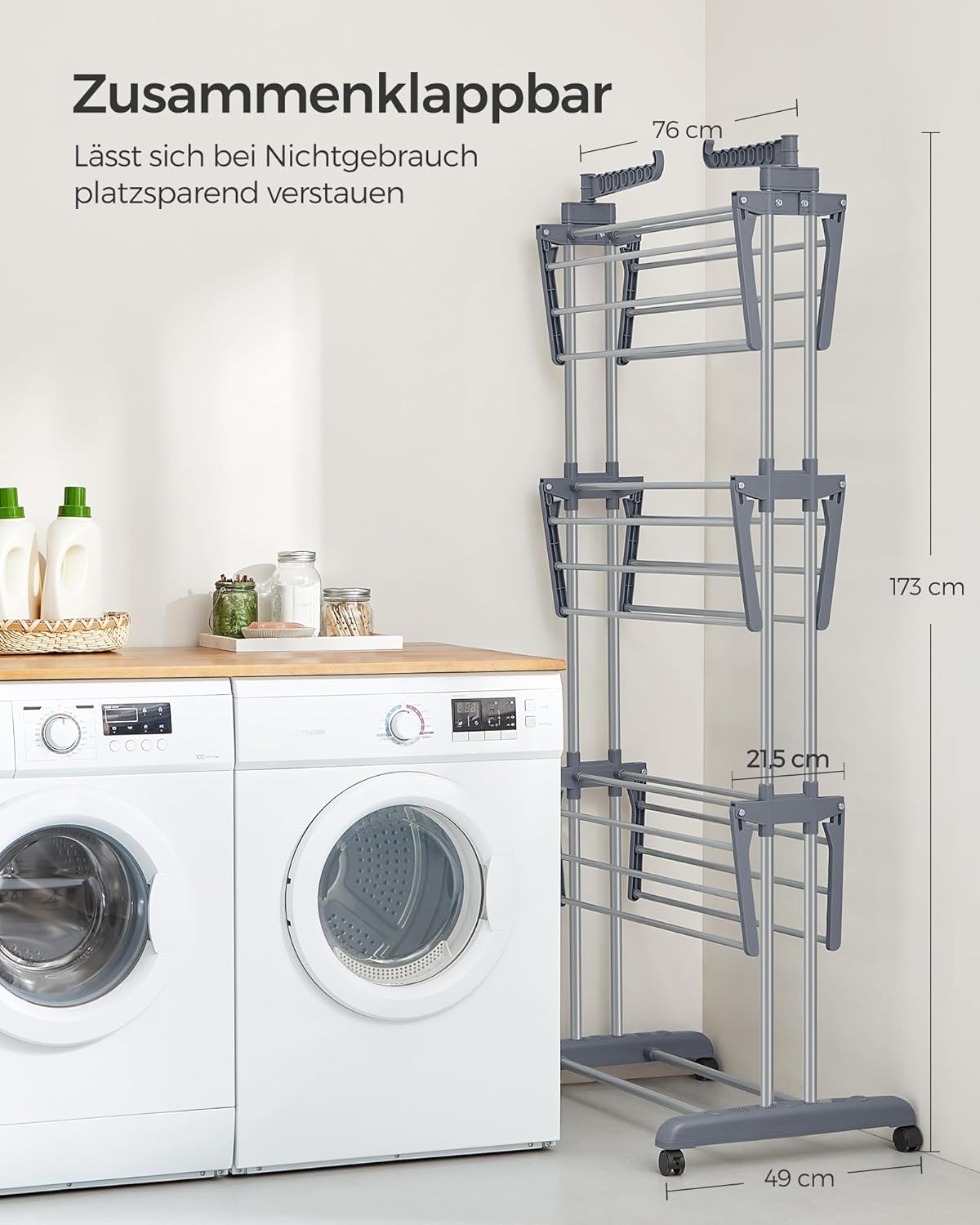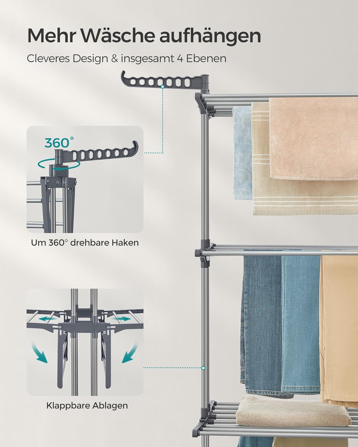 Robust og holdbar: Rustfrit stål, solid plast og forstærkede gribebøjler på begge sider - dette foldbare tørrestativ er robust og holdbart. Fordel vægten af ​​vasketøjet jævnt på tørrestativet for at holde det afbalanceret.