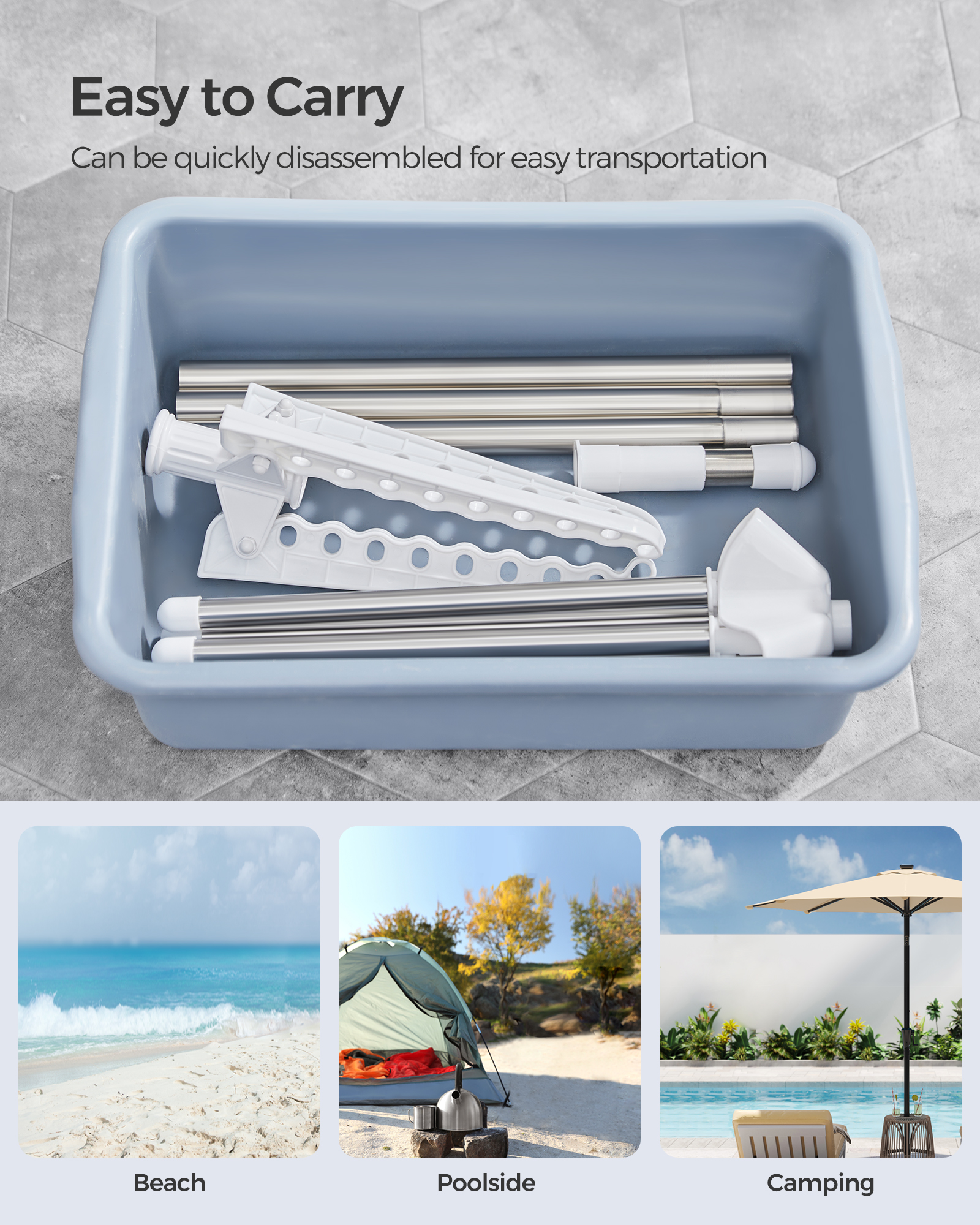 Nem at sætte op og bære rundt: Tørrestativet kommer i 7 dele, hvilket gør det nemt at sætte tørrestativet op eller tage det ned på kort tid, så du kan tage det med dig til tørring af tøj på ferie i campingvognen.
