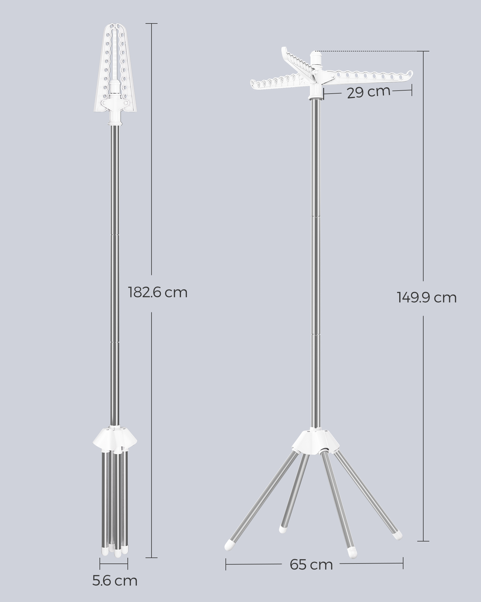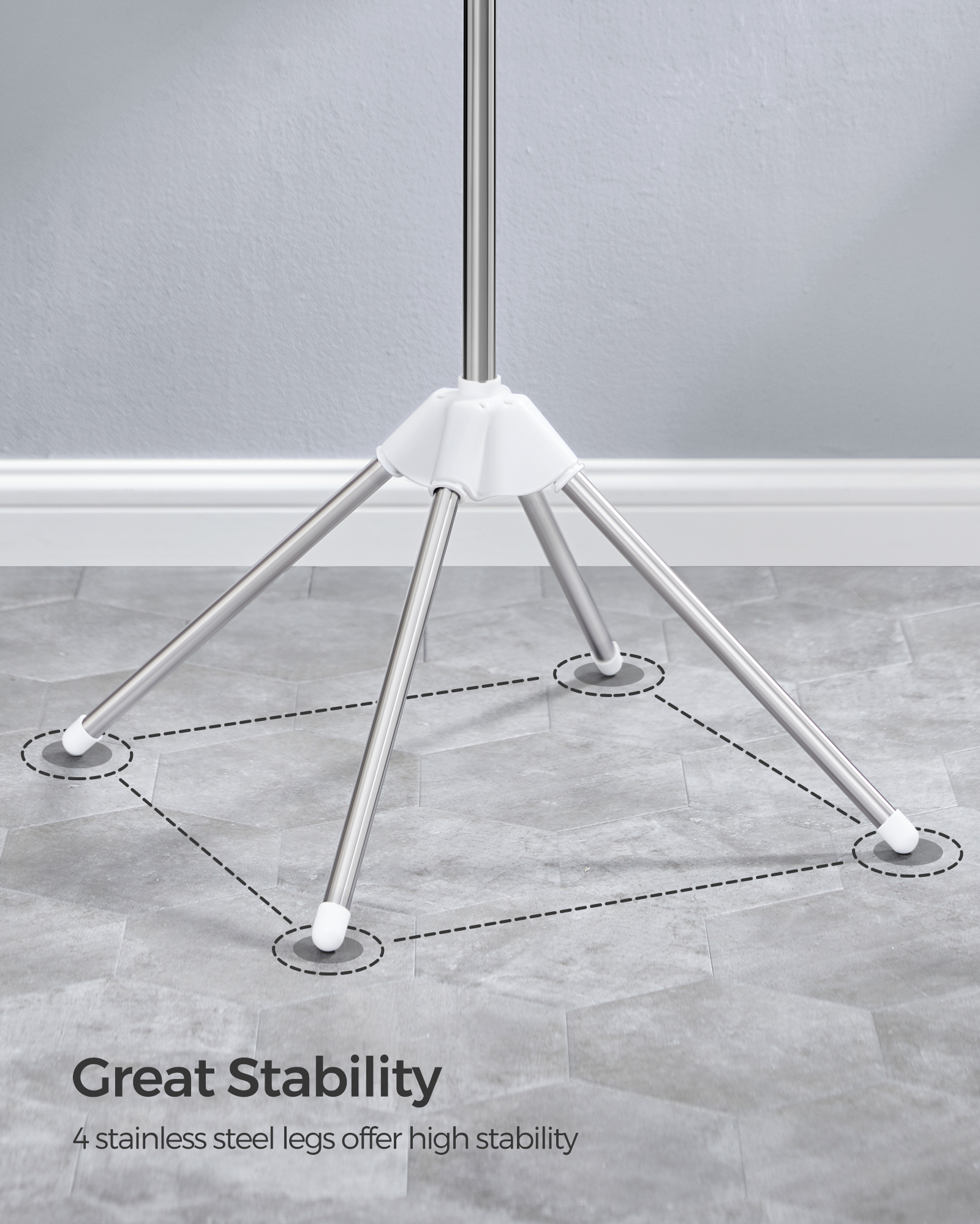 Stabil og solid: Tørrestativets stang og ben er lavet af rustfrit stål for robusthed og de 4 ben giver mere stabilitet sammenlignet med tilsvarende varianter af tørrestativer med 3 ben.