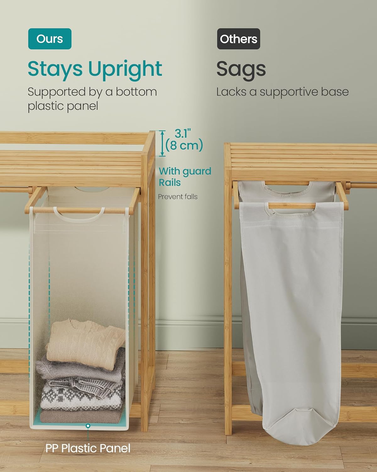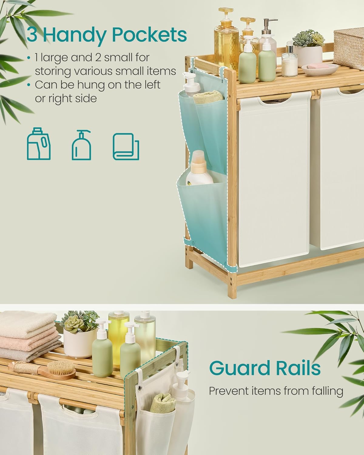 Denne vasketøjskurv med 3 rum på i alt 150 liter, består af 3 vævede vasketøjsposer i creme hvid Oxford stof, hver på 50 liter, som hjælper dig med at sortere vasketøj efter type eller farve og en bambus hylde samt sidelommer, så vaskemiddel og skyllemiddel er lige ved hånden. Du kan opbevare vaskemidler, vaskenet og andre ting på hylderne. Sidelommer giver ekstra plads til opbevaring af småting.