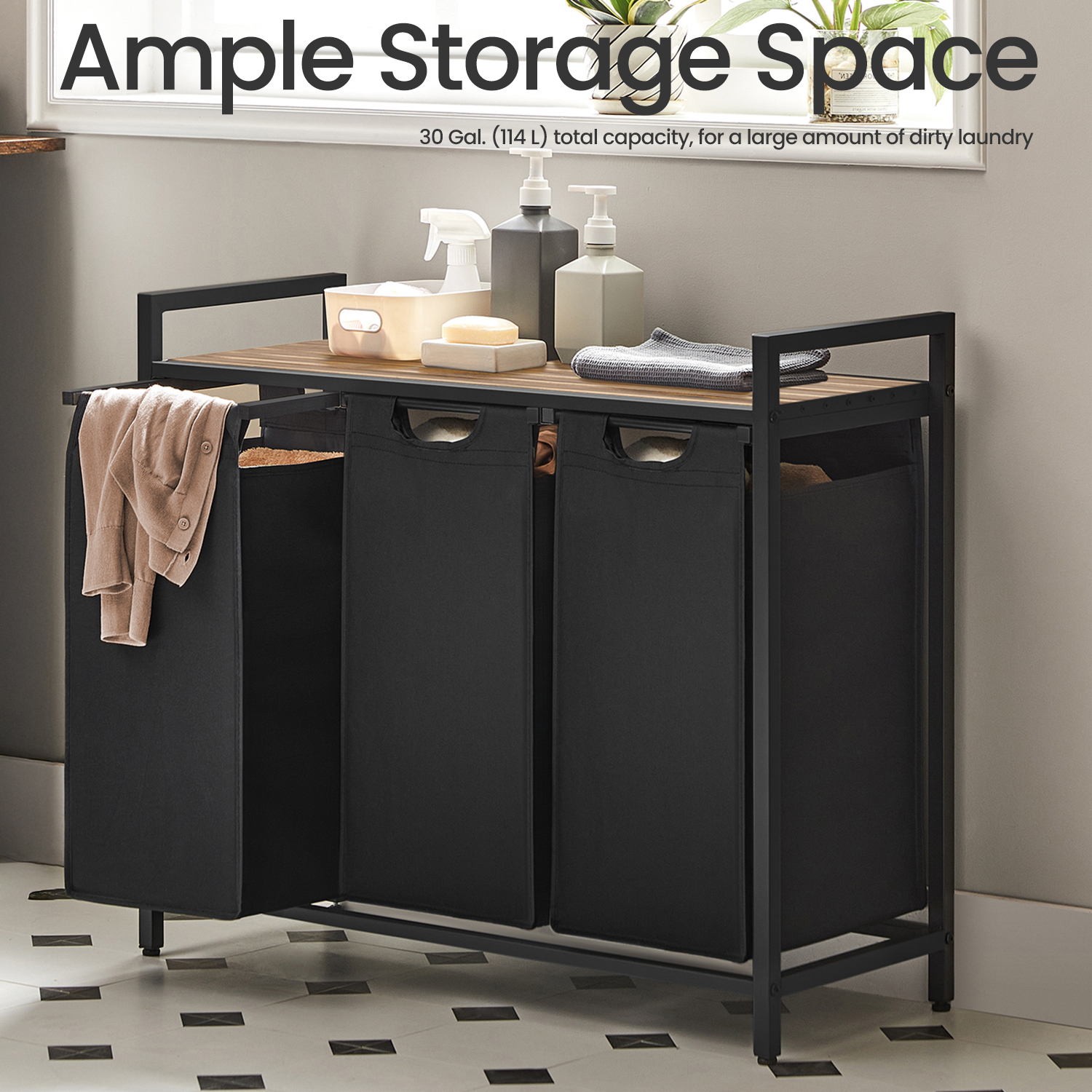 Denne vasketøjskurv med 3 rum på i alt 114 liter, består af 3 vævede vasketøjsposer i sort Oxford stof, hver på 38 liter, som hjælper dig med at sortere vasketøj efter farve og en brun hylde, så vaskemiddel og skyllemiddel er lige ved hånden.