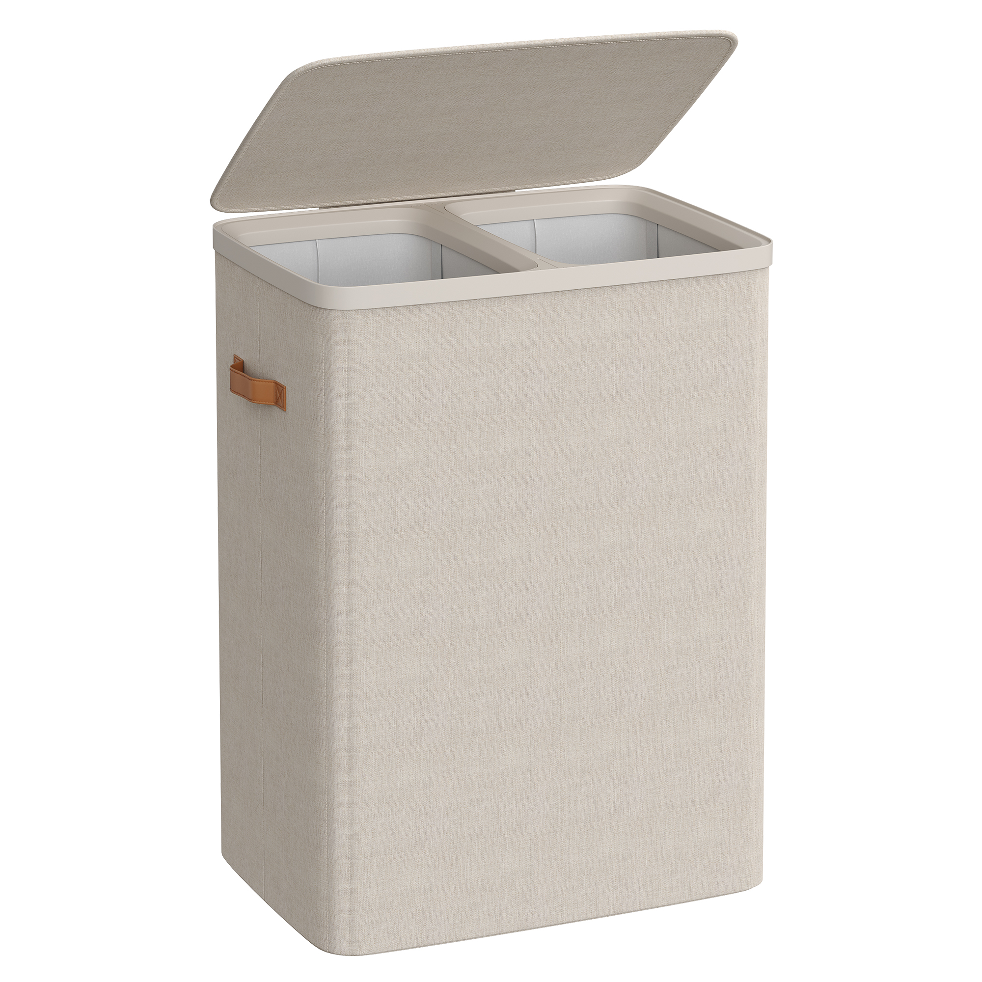 Vasketøjskurv på 170 liter med låg, 2 rum og 2 aftagelige vasketøjsposer - 56 x 40 x 75 cm - beige