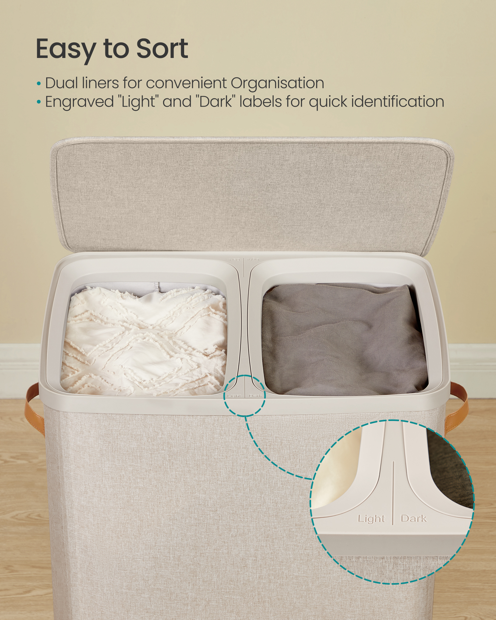Specifikationer - beige vasketøjskurv på 170 liter med 2 rum og 2 vasketøjsposer: